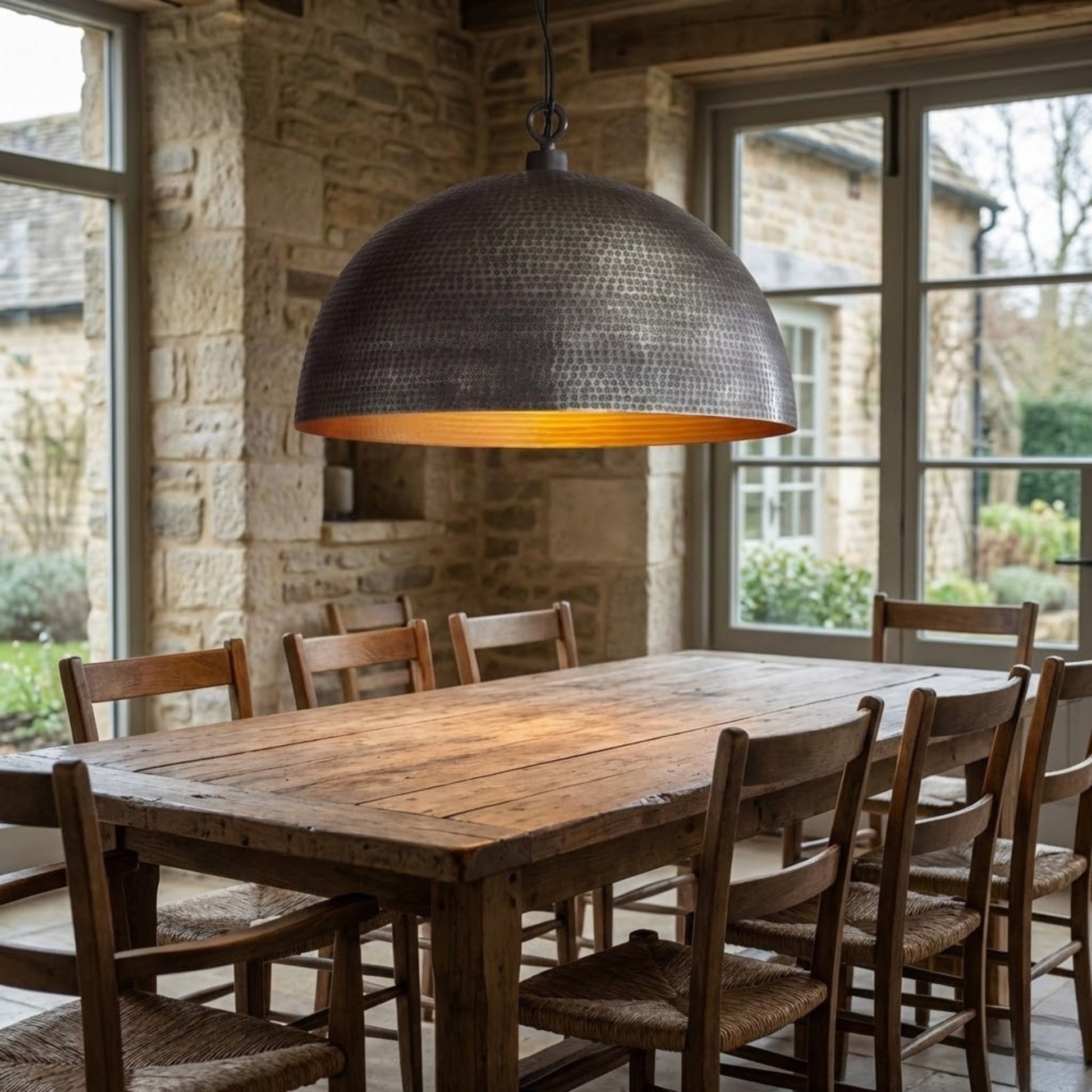 Illuminate your space with the warm, inviting glow of our hand-hammered brass dome pendant light. This striking piece features a unique contrast: a rich, dark brown patina on the exterior for a rustic, aged look, and a polished, hammered brass interior that reflects light beautifully, creating a cozy atmosphere in any room.