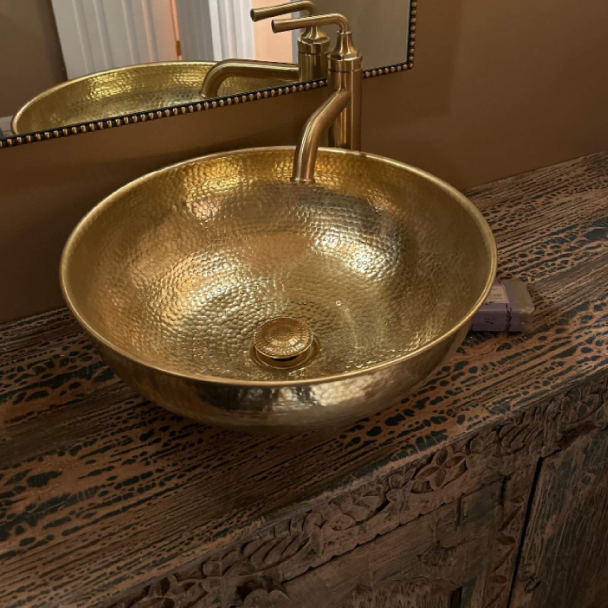 Bring the timeless elegance of Moroccan craftsmanship into your home with our hand-hammered solid brass vessel sink. Each piece is meticulously crafted by our family of artisans, carrying forward a multi-generational legacy of metalwork.